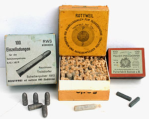 Da nun der Zimmerstutzen stark am Aufblühen war, gab es auch parallel Entwicklungen für den Feuerstutzen, dass kleine Bleigeschosse im cal. 8,15 mit Hohlboden nur mit speziellen Zündhütchen durchgetrieben wurden. Man sprach von Hirtenberger Ladekonus. ( R. Mahrhold 1937 Seite 139 ). |