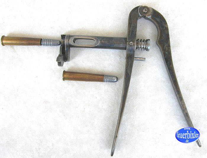 gehärtete Zange zum Setzen von Feuerstutzen-Geschossen. Das Geschoss wird eingeschoben, die Patronenhülse mit