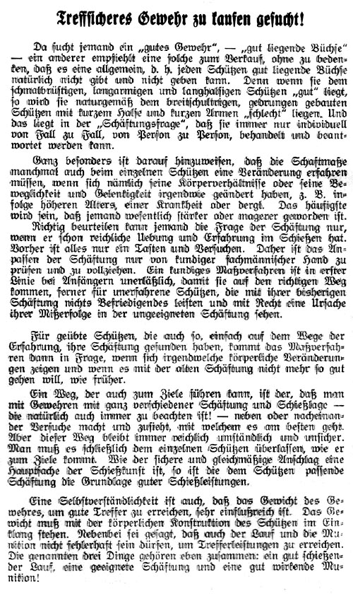 Das gleiche Problem gab es auch schon vor 100 Jahren, als es auch nicht jedem Schützen möglich war, sich einen Schaft speziell anpassen zu lassen. In diesem Artikel aus der Bayerischen Schützenzeitung von 1936 wird dieses Problem ebenfalls aufgegriffen. Auch heute sollte der Schütze stets in der Backe des eventuell käuflich zu erwerbenden Stutzen „Probe liegen“. Nur so kann er sich davon überzeugen, ob er mit dem gewünschten Stutzen auch im Schießbetrieb zurecht kommt.