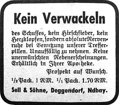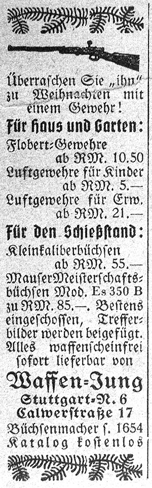 Kuriose Werbeanzeigen aus der damaligen Zeitung „Der Deutsche Schütze“ erheitern uns heutzutage. Insbesondere die empfohlenen Weihnachtsgeschenke für den Gatten: Gewehre für Haus und Garten oder für den Schießstand! Ja, die Gesetzeslage war damals noch eine andere, alle Gewehre und Büchsen "waffenscheinfrei"! Ohne Nebenwirkungen und unauffällig zu nehmen!