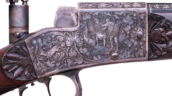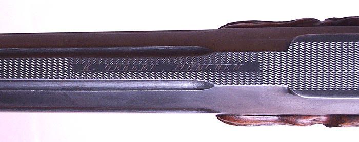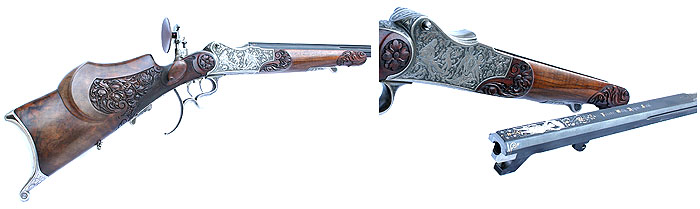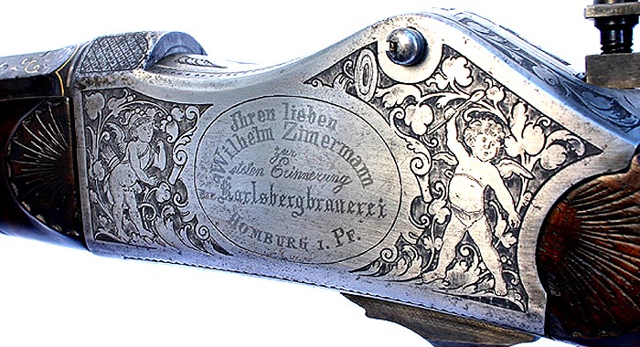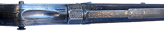 Martini Fallblocksystem von G. Fritsch aus Zweibrücken. Dieser schöne Stutzen war als Erinnerungsgeschenk für einen Mitarbeiter gewidmet. Graviert und in Silber eingelegter Schriftzug. An der Laufwurzel in Gold und Silber eingelegter Herstellername. Mit kanneliertem Lauf und schöner Schaftverschneidung. |