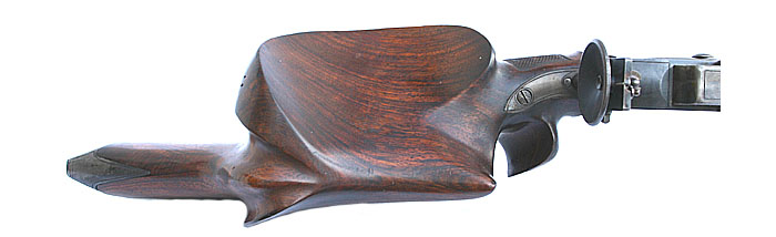 Dieser Feuerstutzen, der ein wenig "verunglückt" aussieht, ist ein sogenannter Krummschaft oder auch Gebogener Schaft. Der mit Original Aydt I - System ausgestattete Haenel-Stutzen wurde speziell für Schützen angeboten, die zwar im Anschlag rechts schießen, jedoch mit dem linken Auge in die Visierung blicken. Durch die sehr ausgeprägte Tiroler Backe ist dies problemlos möglich. Das gleiche war auch für Linksschützen erhältlich, die mit dem rechten Auge anvisieren. Im Waffenkatalog Georg Knaak / Berlin im Jahre 1910 wurde diese besondere Schäftung mit einem Aufschlag von 10 Mark berechnet. Quelle: Privatsammlung |