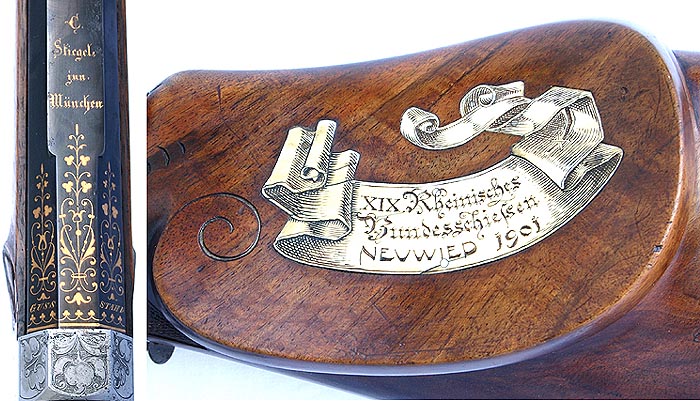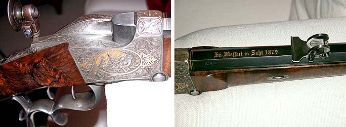 Dieser wunderschöne Suhler Feuerstutzen wurde um 1900 mit einem Fallblock-System Kessler Martini im Kaliber 8,15x46R hergestellt und kostete damals bei von Carl Stiegele jun. München 245 Goldmark. Er hat einen 4fach-Stecher. Der Tiroler Schaft ist mit Elfenbein eingelegt. Auf dem Lauf befinden sich Goldauflagen. Gesamtlänge 119cm und Lauflänge 73,5cm. Ein Prachtstück, an dem man sich nicht satt sehen kann. Quelle: Privatsammlung |