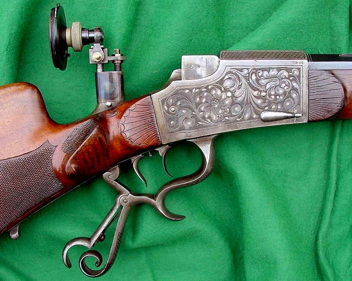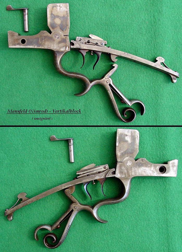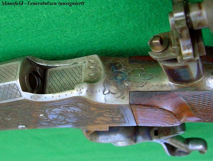 Dieser Mansfeld Feuerstutzen aus dem Jahre 1901 hat einen einen 3fach-Stecher und Bornmüller-Spanner. Das System ist mit einem Vertikaldrehblock ausgestattet. Der mit dem Verschlusshebel direkt verbundene Block bewegt sich in senkrechter Richtung gleichlaufend mit der Stoßfläche des Laufes. Bilder eingesandt von: Claus Winkler / Oberpfalz |
