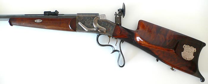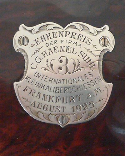 Zum internationalen Kleinkaliberschießen im Jahr 1925 in Frankfurt/Main stiftete die Firma C. G. Haenel aus Suhl diesen prächtigen KK-Scheibenstutzen. Der Stutzen ist mit einem original Aydt I System im Kaliber 22lr. ausgerüstet und hat einen 3fach übersetzten Stecher. Herstellungsjahr 1925