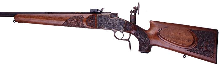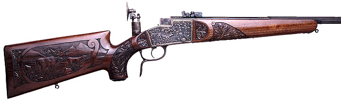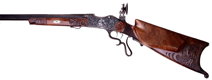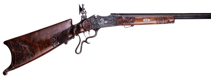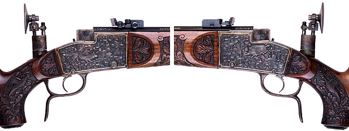 Nachdem in den 1920er und 1930er Jahren das Kleinkaliber-Gewehr zunehmend das Schießen mit dem Feuerstutzen verdrängte, wurde auch eine größere Zahl verschiedener KK-Stutzen hergestellt, die mit den Systemen und Komponenten der klassischen Feuerstutzen ausgestattet waren – jedoch mit Kleinkaliber-Munition geschossen wurden. Der hier gezeigte Scheibenstutzen im Kaliber .22 lr aus dem Jahre 1935 im Waffensystem Kessler Martini wurde von den Waffenwerken Venus Oskar Will Zella-Mehlis hergestellt. Der Lauf ist aus Böhler-Stahl, die Waffen-Nummer ist die 888. Diese Sportwaffe war damals ein Geschenk an den Gauleiter von Tirol und Vorarlberg Franz Hofer. Gesamtlänge 1215mm, Lauflänge 765mm, Gewicht 6520gr. Visierung: Gabeldiopter, Sternkorn mit zusätzlichem Ringkorn dabei. Deutscher Schaft, 27mm starker Achtkant-Kleinkaliberlauf, Holzverschneidung links: Rehbock, rechts Wildschütze, Vorderschaft Hundskopf und Eichenblätter. Stecher 3fach übersetzt. Gravuren: Ornamente an der ganzen Waffe, rechts: Schütze im Anschlag, links Schützenliesl. Quelle: Walter Gasteiger /Kufstein  |