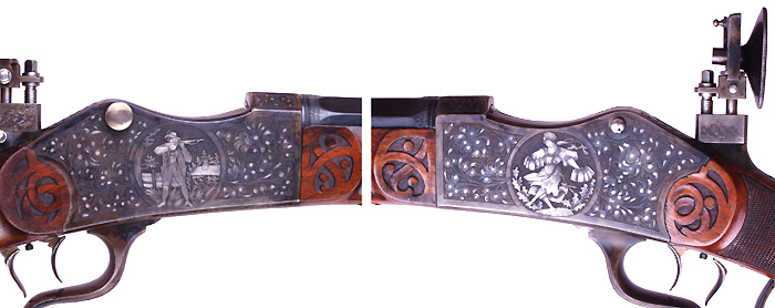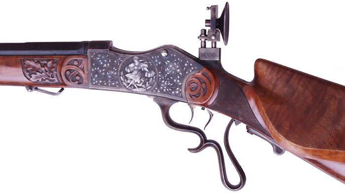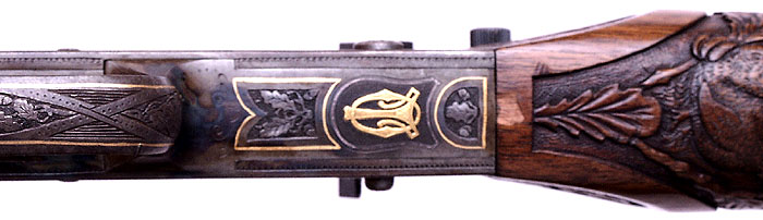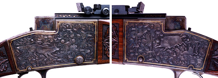 Perlhuhn am Vorderschaft, am Pistolengriff Fasane und Eichenlaub. Am
