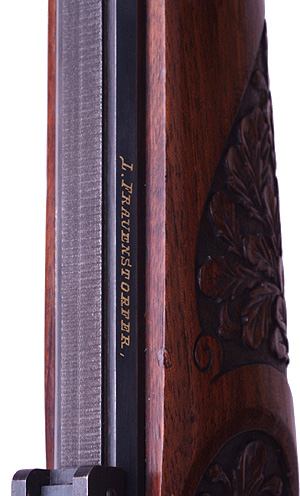 Dieses aufwändig gestaltete Kleinkaliber-Gewehr weicht von den bekannten Stutzen in einigen Details ab. Es ist weder ein Scheibenstutzen, noch ein KK-Sportgewehr. Auch kann man es nicht als eine Jagdwaffe bezeichnen. Der Schaft ist mit einem Pistolengriff geformt und hat eine ovale Backe. Das Gewehr hat keinen Stecher. Der Abzug ist am Systemkasten oben mit einem Vierkant einzustellen Das KK-Gewehr im Kaliber .22 lr. ist von der Firma Langenhahn aus Zella St. Blasii. Der Hersteller ist L.Frauenstorfer Mannheim Dies ist in Gold am Lauf eingelegt. Die Visierung besteht aus einem Diopter mit Feldvisier Balkenkorn. Die Waffe trägt die Nummer 5663 und das Herstellungsjahr ist ca.1920. Die Gesamtlänge beträgt 1110mm, die Lauflänge 724mm und das Gewicht 3760gr. Das Laufäußere hat 14 Lauffalzen am Achtkantlauf. Holzverschneidung: Eichenlaub und