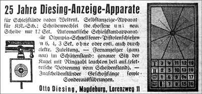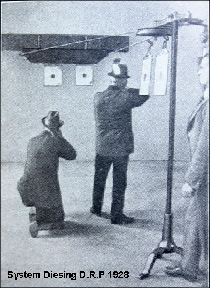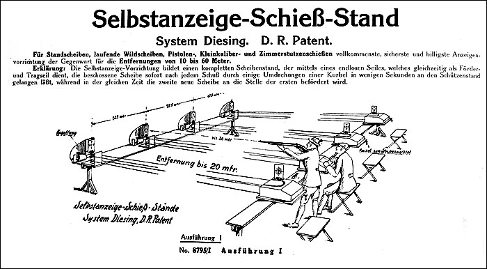 | Wie bereits erläutert, ist das Schießen mit Zieler und Schreiber ein aufwändiges Unterfangen. Der Personalbedarf für jeden einzelnen Stand und Schützen ist relativ hoch. Als in den 1920er Jahren das Kleinkaliber-Schießen auch in Deutschland immer populärer wurde, begannen die ersten Hersteller von Scheibenzuganlagen damit, verschiedene Konstruktionen zu entwerfen, mit denen das Schießen auf die größeren Distanzen preisgünstiger und weniger aufwändig gestaltet werden konnte. Vor allem arbbeitete man auch daran, die Treffer automatisch aufzeigen lassen zu können. |
