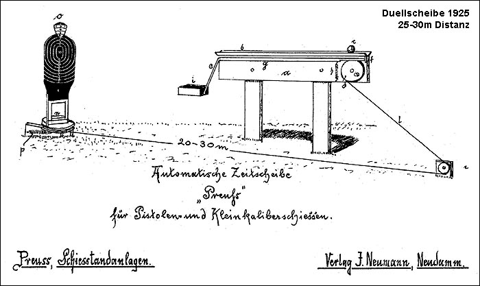 Das Schießen auf mittlere Distanzen Als das Pistolenschießen nach den Regeln des Schützenbundes immer populärer wurde, kamen auch die ersten Hersteller mit automatisierten Seilzugständen auf den Markt. In den 1920er Jahren wurden in Deutschland die ersten handbetriebenen Seilzugstände eingesetzt. Durch mechanische Stände aus dem jagdlichen Bereich (Laufender Keiler, etc.) war bei den Herstellern schon einschlägige technische Erfahrung vorhanden. Von Preuss-Schießstandanlagen wurde um 1925 folgende Konstruktion angeboten: Ein Endlos-Drahtseil läuft über Rollen und wird per Kurbel an einer Fahrradfelge zum Schützen zurückgezogen. Der Scheibenhalter liegt lose auf dem Drahtseil auf.