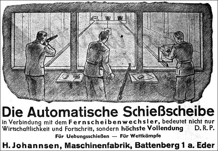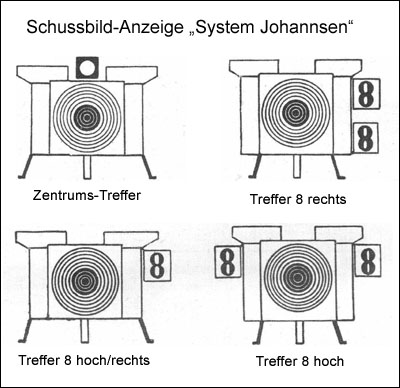 Automatische Anzeige „System Johannsen“ Bereits seit den 1920er Jahren wurde von der Firma Johannsen aus dem nordhessischen Battenberg an einem Anzeigesystem getüftelt, welches den Zieler beim 50m-Kleinkaliber-Schießen entbehrlich macht. Hierbei sollte nicht nur die Ringzahl für den Schützen sichtbar sein, sondern auch die Trefferlage angezeigt werden. Das Automatische Ringscheibensystem Johannsen besaß D.R.P (Deutsches Reichspatent) und auch Auslandspatente. |