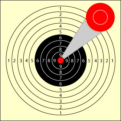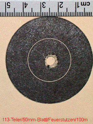 Beim Feuerstutzenschießen gibt es meist ein kleines aufgeklebtes Pappscheibchen auf der Scheibe, die genau den 10er abdeckt. Das ist das Blattl oder der Blattl-Karton, der – zur klassischen Auswertung per Teilermessmaschine – abgelöst werden kann. Diese Blattl-Kartons gibt es in unterschiedlichen Farben. Bei der kombinierten Punkt-/Meisterserie ist er schwarz, auf der Glücksscheibe grün und die Hauptscheibe ist rot. Geburtstags- oder Ehrenscheiben werden oft auf blaue Scheiben/Blattl geschossen. Auf der normalen KK-100m-Scheibe (die zumeist in Bayern für das Feuerstutzenschießen genutzt wird) hat der 10er einen Durchmesser von 50mm, also ist das Blattl ebenfalls in dieser Größe. |