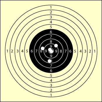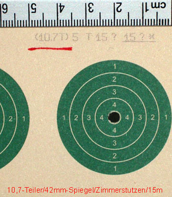 Beim Zimmerstutzenschießen liegt die Distanz heutzutage entweder bei 15m oder auch bei 10m, wenn keine 15m-Stände vorhanden sind. Hier wird teilweise auf Kartonstreifen mit fünf Scheibenbildern (à 1 Schuss) geschossen oder auf eine quadratische Scheibe, auf die die gesamten fünf Schuss der Serie abgegeben werden. Bei Zimmerstutzen-Scheibenstreifen, die 5kreisig sind, gibt es nur den Spiegel. Hier besteht also jedes Scheibenbild nur aus dem Spiegel. Für ein „gutes Blattl“ muss der kleine Zentrumspunkt weg geschossen werden. |