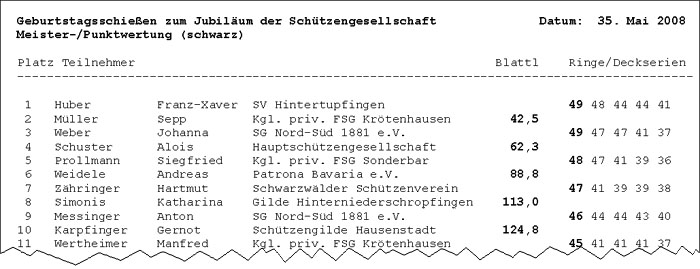 Die Scheibengattungen und WertungenIm Ladschreiben ist aufgeführt, welche Wertungen und Scheibengattungen bei der Veranstaltung geschossen werden. Hier gibt es die unterschiedlichsten Varianten, die detailliert aufgeführt werden müssen. Die Punkt-/Meisterserie – Vererbte WertungBei nahezu jedem Traditionspreisschießen in Bayern wird die sogenannte Punkt-/Meisterserie angeboten. Diese Wertung wird auf Scheibenkartons mit schwarzem Blattl geschossen, bzw. bei Zimmerstutzen auf schwarze Scheibenspiegel. Pro Serie werden fünf Schuss abgegeben, also sind bei 10kreisigen Scheiben maximal 50 Ringe zu erreichen. Da es bei Zimmerstutzen auch 5kreisige Scheiben gibt, können hier maximal 25 Ringe fallen. Werden bei einem Schießen ausnahmsweise keine 5er sondern 10er Serien geschossen, steht dies ebenfalls im Ladschreiben. Bei der Punkt-/Meisterserie hat der Schütze die Möglichkeit, sich entweder mit einem guten Blattl oder einer hohen Ringzahl auf die vorderen Ränge zu schießen. Denn es zählen sowohl die Zentrumstreffer wie auch die Ringe. Je nach dem, mit welcher Wertung (Blattl oder Ring) der Schütze eine bessere Platzierung erreicht, wird diese herangezogen. Dies wird Vererbte Wertung oder Adlerwertung genannt. Das Ergebnis ist alternierend, abwechselnd wird das beste Blattl-Ergebnis und das beste Ring-Ergebnis notiert. Anschließend das zweitbeste Blattl-Ergebnis und das zweitbeste Ring-Ergebnis, usw. Hat ein Schütze beispielsweise nur 35 Ringe (von 50 möglichen) erreicht, so würde er in der Ergebnisliste weit hinten stehen. Hat er dabei aber ein sehr gutes Blattl geschossen, so kann ihn das sehr weit nach vorne bringen – und das eher schlechte Ring-Ergebnis fällt somit in der Wertung unter den Tisch. Bei einer Punkt-/Meisterwertung wird die Ergebnisliste mit dem bestem Blattl-Ergebnis angeführt. Bei einer Meister-/Punktwertung wird der Schütze mit dem besten Ring-Ergebnis zuerst genannt. Es bleibt stets dem Veranstalter überlassen, ob er dem besten Ring-Ergebnis oder dem besten Blattl-Ergebnis den Vorzug gibt – es muss jedoch zuvor im Ladschreiben festgelegt sein. Beim Ring-Ergebnis werden oft auch die Deckserien abgedruckt, denn dies ist für die Reihung notwendig. Bei Ringgleichheit wird die nächst bessere Serie des Schützen herangezogen. Da selten zwei identische Teiler geschossen werden, ist eine Notierung des Deckteilers meist nicht erforderlich. Beim Zimmerstutzenschießen wird der schwarze 5er-Streifen für die