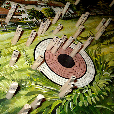 eine bemalte Holzscheibe zu schießen. Solche Scheiben werden kunstvoll