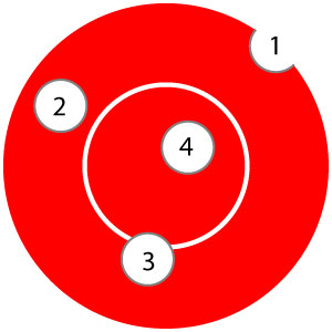 Das Blattl hat einen Innenring und einen Außenring. Und dies ist so bei den allermeisten Blattl-Größen wie sie auf größere Distanzen und anderen Ständen, z.B. in Österreich verwendet werden. Je nach dem an welcher Stelle der Schütze das Blattl trifft, wird das geschossene Blattl auch bezeichnet.