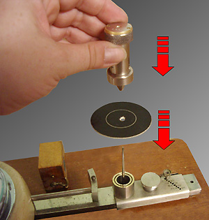 Die hier beispielhaft gezeigte Teilermessmaschine ist vom Hersteller Josef Feichtmaier aus Geiselhöring, sie verrichtet seit mehr als 50 Jahren jedes Wochenende tadellos ihren „Vortel-Dienst“. Zum Auswerten der kleinen Pappscheibe wird folgendermaßen vorgegangen: Das Papp-Blattl wird vorsichtig durch das auszuwertende Schussloch auf den Dorn gesteckt. Anschließend wird der Halter (1) auf den Dorn aufgeschoben. Der Halter hat unten einen konischen Zapfen, der das Schussloch zentriert auf dem Dorn hält. Der Halter ist innen mit einer Spiralfeder versehen, so dass man ihn
