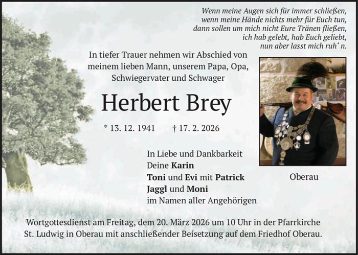 Die Traditionsschützen, Freunde und Verwandte trauern um Herbert Brey † 17. Februar 2026 . |