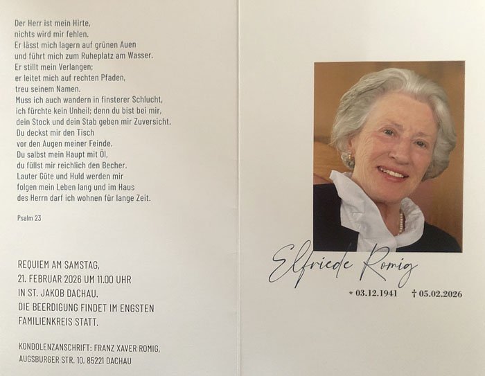 Die Feuerschützengesellschaft Dachau, die Schützenkameraden, Freunde und Verwandte trauern um Franz Xavers Ehefrau Elfriede Romig * 3. Dezember 1941 Wir nehmen Abschied von Frau Elfriede Romig, Mitglied bei der kgl. Priv. Feuerschützengesellenschaft Dachau. |