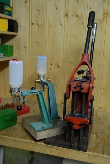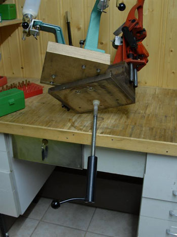 Wenn man sich ein „Karussell“ baut, auf dem die einzelnen Stationen zum Wiederladen fest installiert sind, braucht die jeweils benötigte Gerätschaft nur in Richtung des Schützen gedreht werden. Ein mühsames Festschrauben einzelner Komponenten von Wiederladergerätschaften entfällt. Sind die abgeschossenen Hülsen bereits gereinigt, kann im ersten Arbeitsgang mit dem Ausstoßen des Zündhütchens begonnen werden. Im gleichen Arbeitsgang wird bei dieser Anordnung kalibriert.