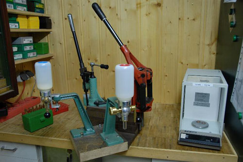 Bei diesem Wiederlader Arbeitsplatz sind zwei Pulverabfüllgeräte vorhanden. Der eine Pulverabfüller dient für das Pulver, der zweite für die Verdämmung mit beispielsweise Grieß. Griffbereit auf der rechten Seite des Arbeitsplatzes ist die elektronische Pulverwaage, um die Pulverabfüllmenge sporadisch zu prüfen. |
